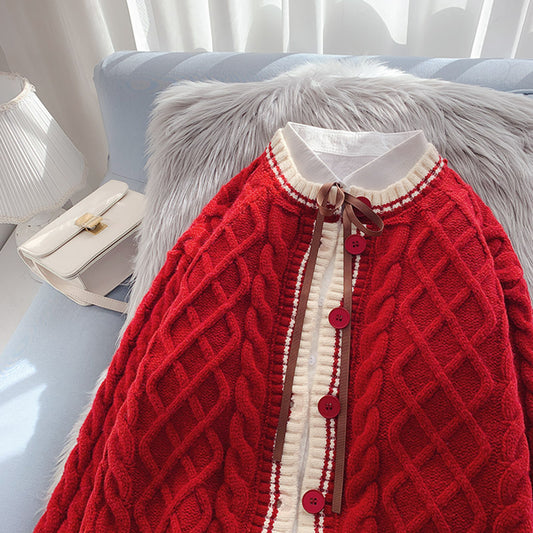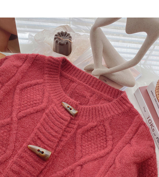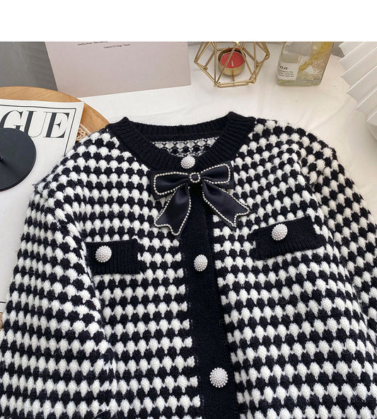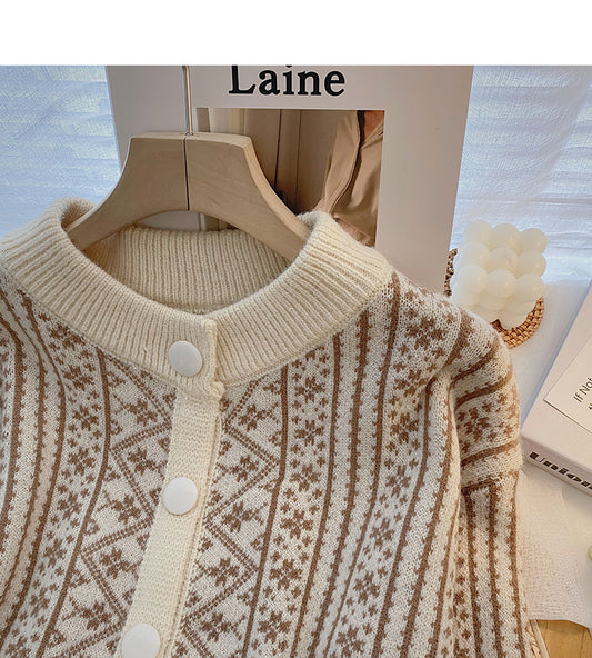 Vintage rhombic contrast cardigan sweater knitted jacket 5242