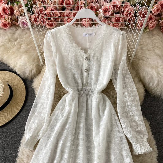 Women's dress with narrow waist and solid color bubble sleeve lace 3420
