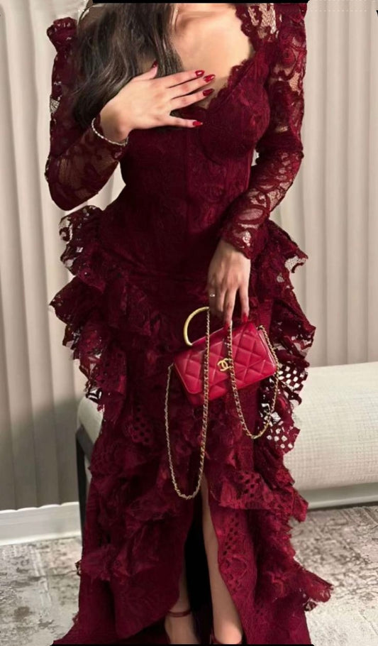 Glam Burgundy Lace Mermaid Maxi Dress | V-Neck Layered Ruffle Dress, Gala Friends Gathering Fashion Outfit gh6452