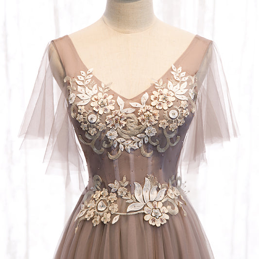 A-Line Tulle V-Neck Long Prom Dress With Sequins, Evening Dress gh1179
