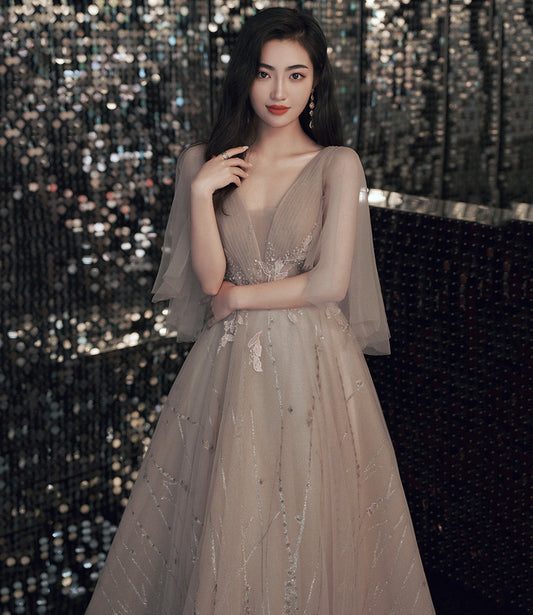 Champagne tulle sequins long prom dress A line evening dress 10472