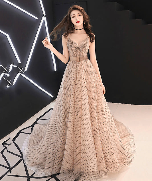 Pink v neck tulle beads prom dress A line evening dress 8377