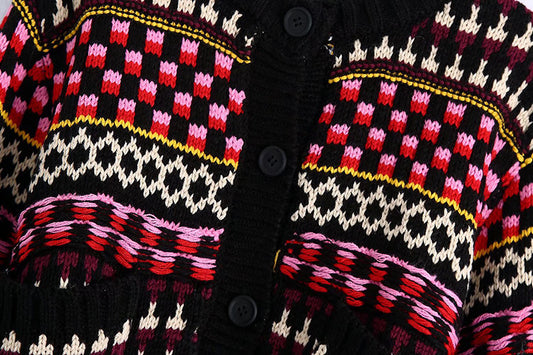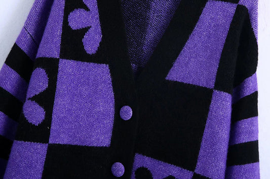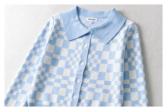 Checkerboard Plaid Polo neck sweater short sweater cardigan jacket 7357