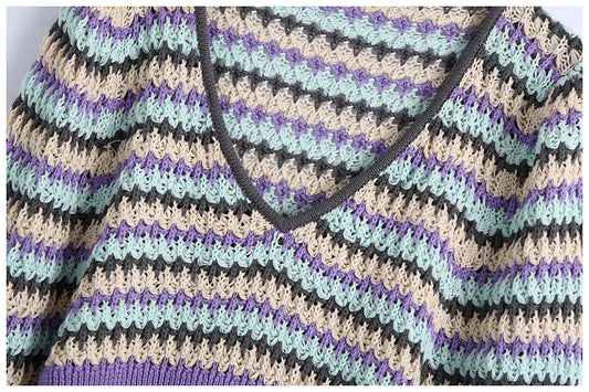V-neck Lantern Sleeve T-Shirt contrast stripe hollowed out 7230