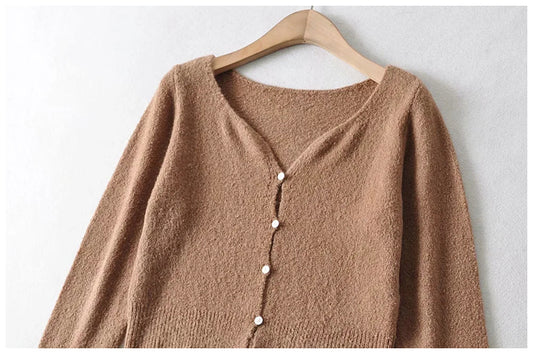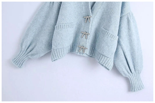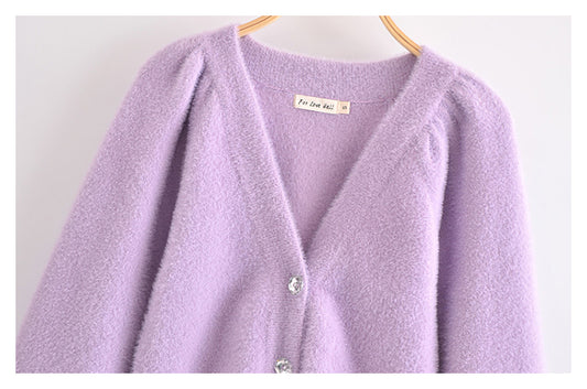 V-neck three button Lantern Sleeve Top Coat women's knitted cardigan 7237