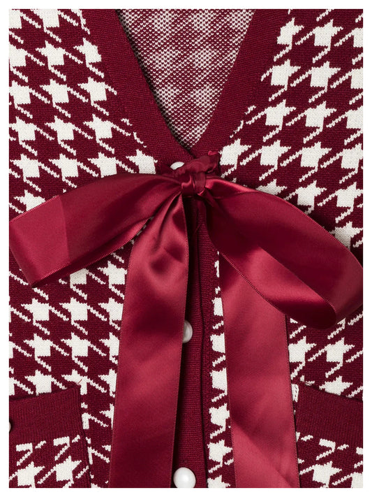 Chiffon Check Ribbon Bow V-neck slim long sleeve knitted coat 7224