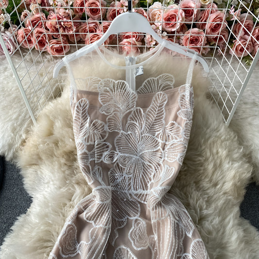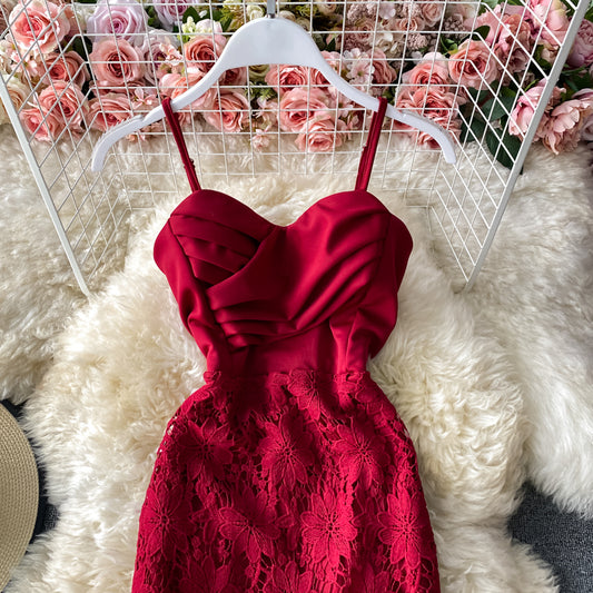 Lace round neck, sweet waist, slim A-line skirt, medium length skirt 3297
