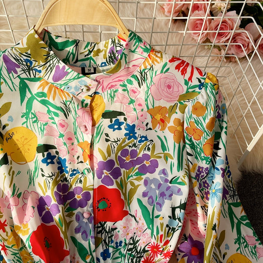 Stand collar bubble sleeve fashion printed waist length skirt 3191