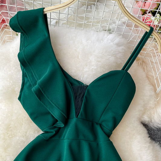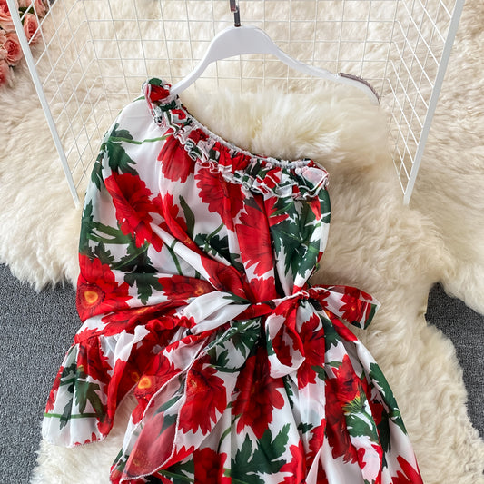 Slim slant neck off shoulder dress fluffy skirt 3200
