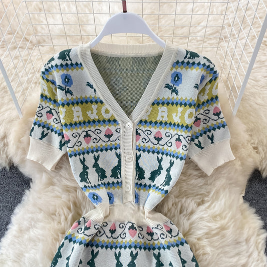 Cartoon rabbit letter jacquard V-neck slim dress 3196