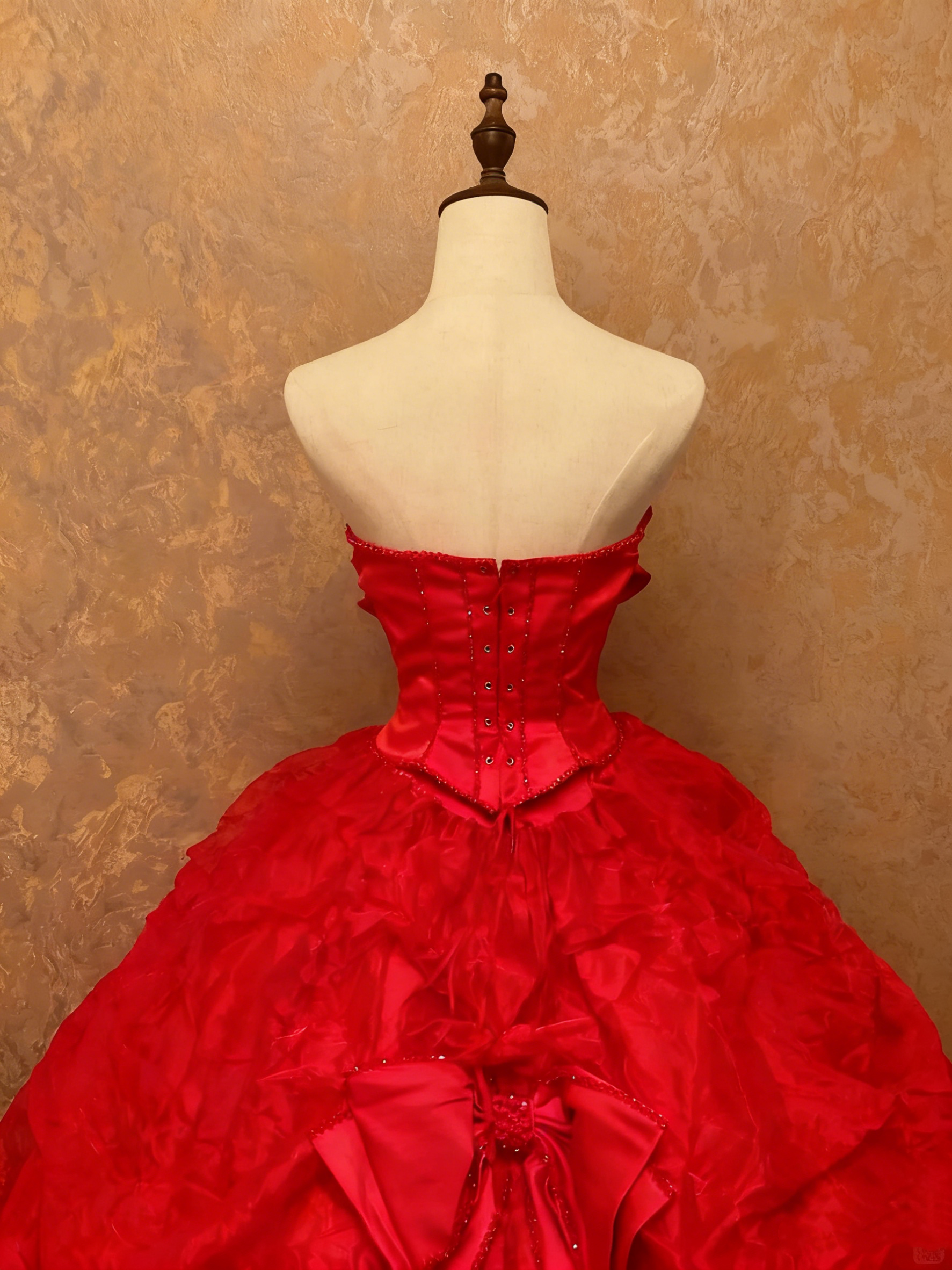 girlhomeshops-Crimson Satin Strapless Bow Rhinestone-Embellished Floor-Length Court-Style Gown gh6371