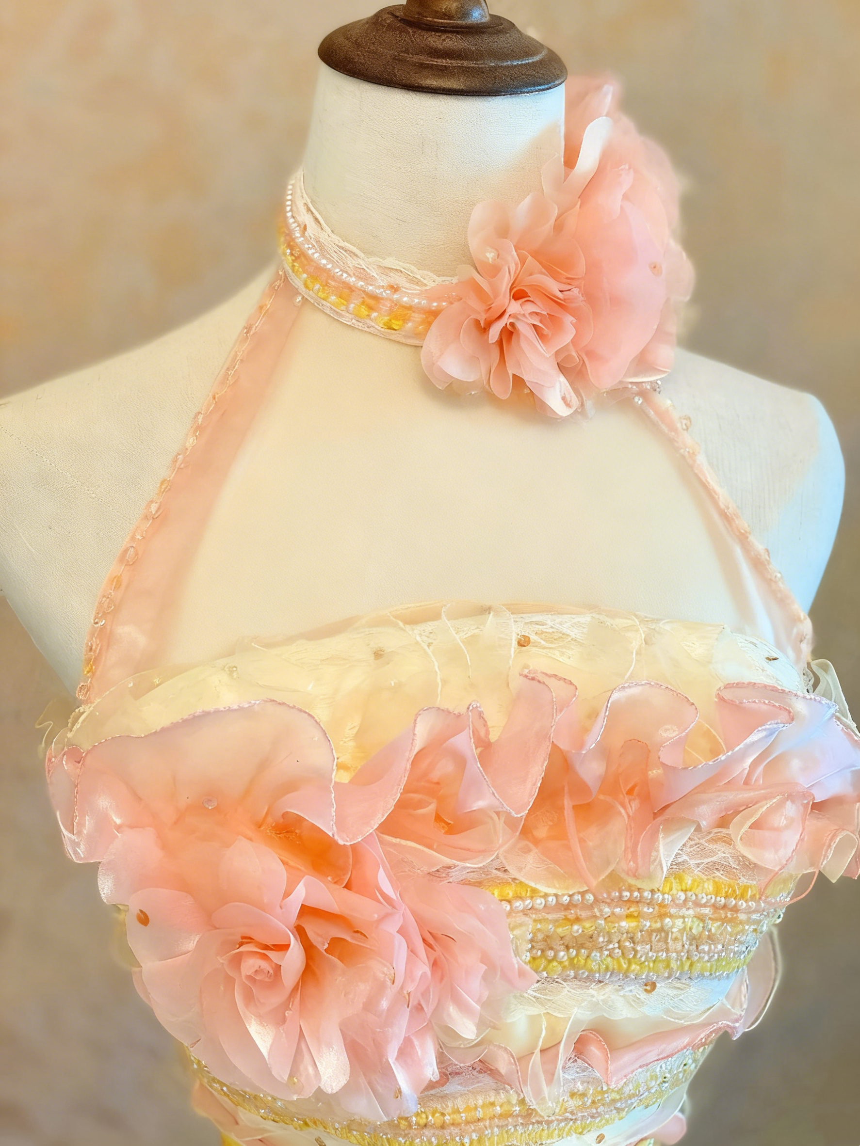 girlhomeshops-Pink-Yellow Gradient Satin Halter-Neck 3D Flower-Embellished Floor-Length Court-Style Gown gh6372