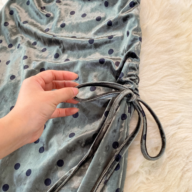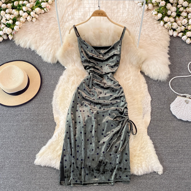 Velvet sexy swing neck long suspender drawstring split dress 3757