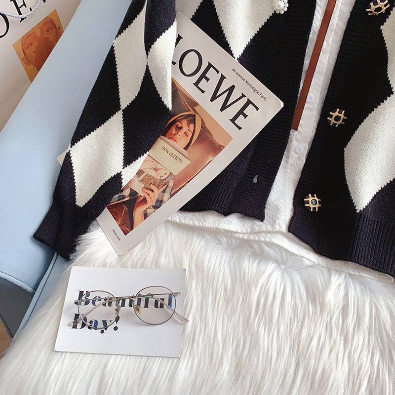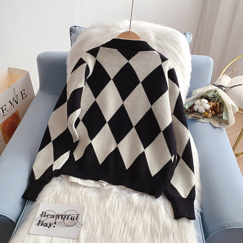 Vintage diamond V-neck knitted cardigan sweater coat 5046