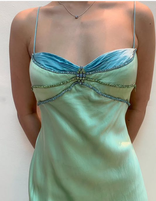 Green Vintage Fashion Beaded Spaghetti Straps Long satin Formal Prom Dress, Evening Dress, Party Dress gh3501
