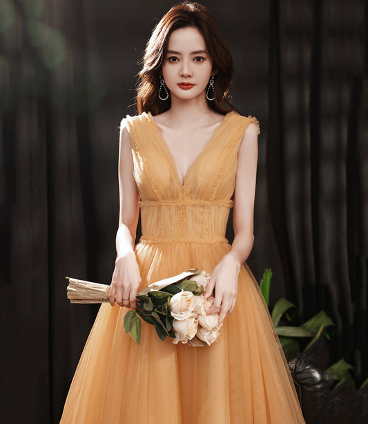 Yellow V-neck stylish elegant long chiffon ball gown evening dress party dress gh3053