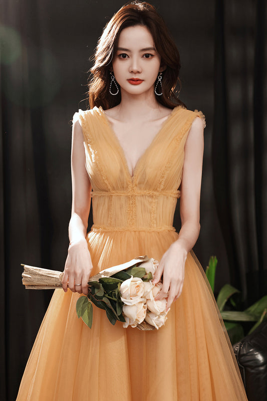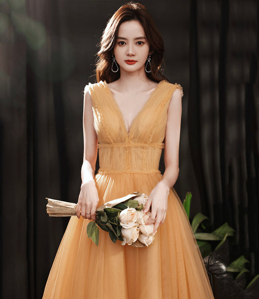 Yellow v neck tulle short prom dress homecoming dress 8982