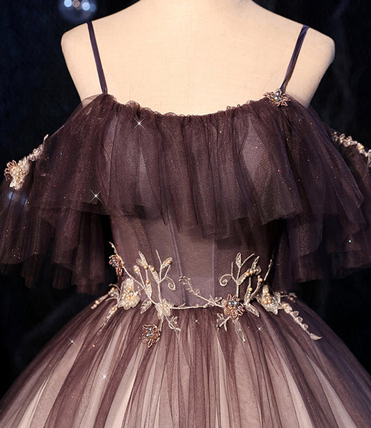 Brown Delicate Floral Applique Fashion A-Line Long Tulle Ball Gown Evening Dress 8721
