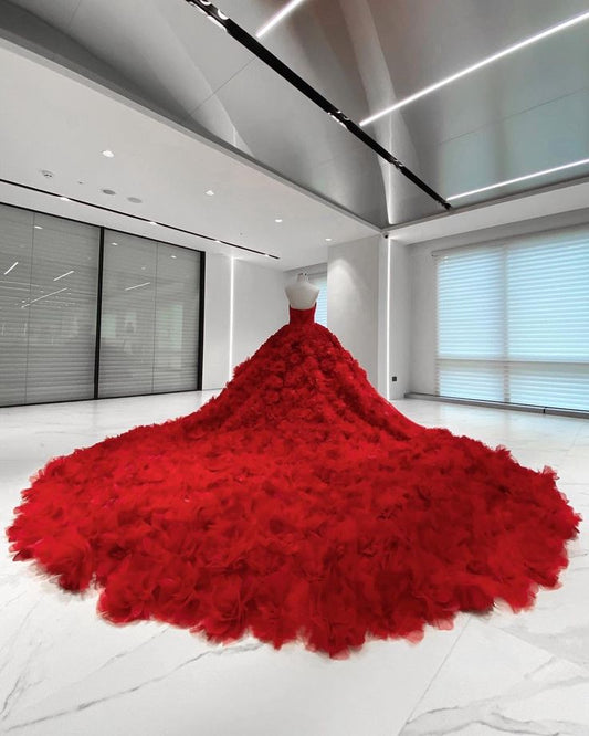 Red gorgeous elegant tube top floral long floor length trailing tulle ball gown evening gown wedding dress gh3140