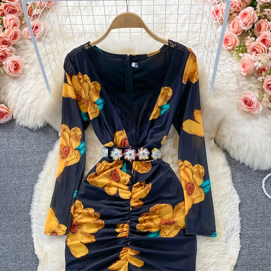 Sexy V-neck printed elastic slim wrap hip dress 3248