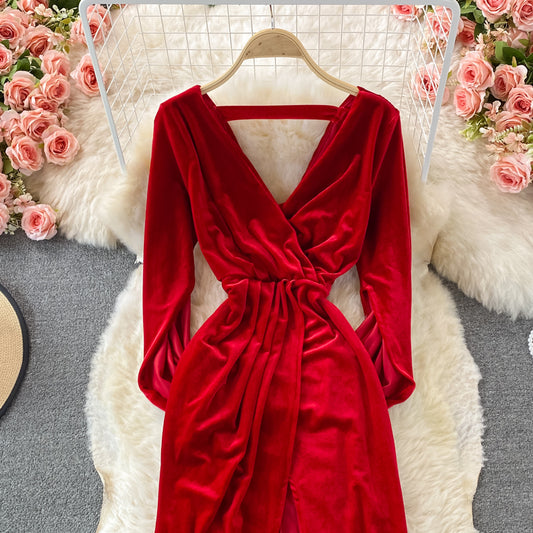 Temperament deep V-neck split buttock velvet dress 3240