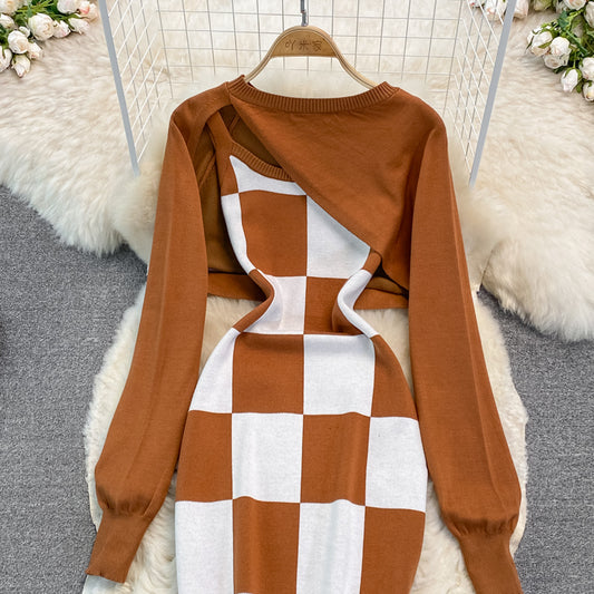 Zebra jacquard knitted square neck dress tight Hip Wrap Skirt 3760