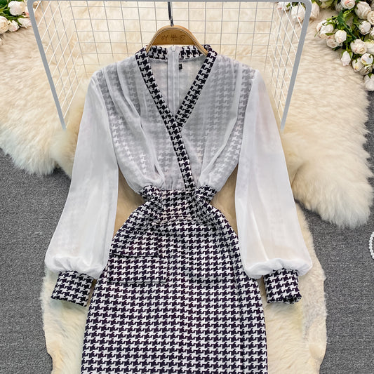 Slim, thin, split temperament, bronzed print V-neck dress 3767