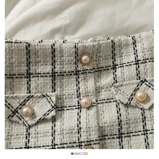 Hong Kong style retro bright silk Plaid tweed high waist A-shaped skirt 2527