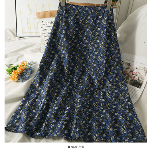 Hong Kong style retro floral medium length high waist A-line skirt 2533