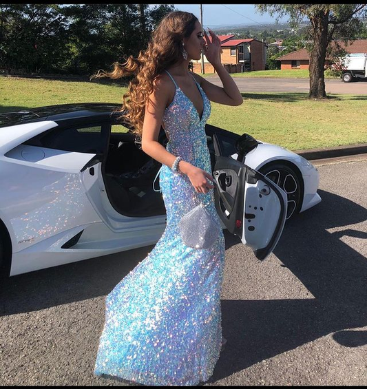 Robe de bal longue à paillettes bleu clair avec col en V et fente gh2239