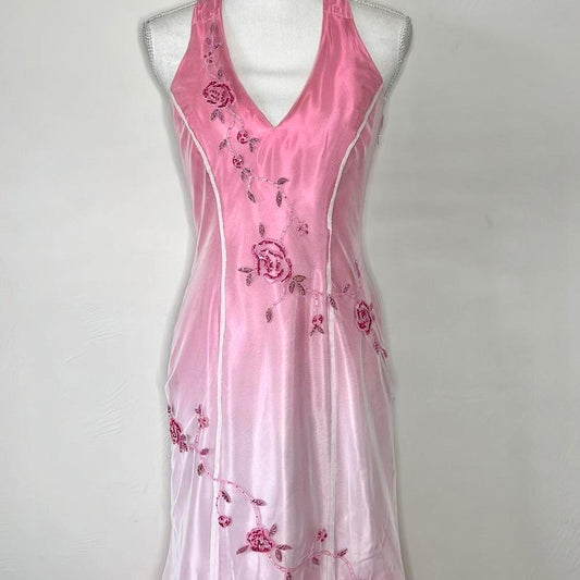 Robe de soirée longue en satin et tulle rose, élégante, col en V, motif floral exquis, perles, dos nu, dégradé de couleurs, gh3577
