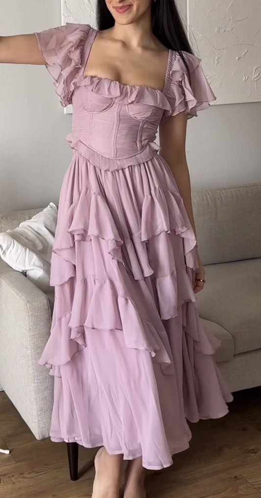 Robe de soirée longue en mousseline de soie rose, élégante et unique, à bretelles spaghetti, décolleté en cœur, à volants, longueur au sol, robe de bal, gh4075