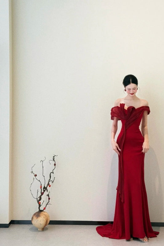 Girlhomeshops - Robe de bal moulante rouge en satin, épaules dénudées, longueur ras du sol, gh5963