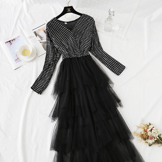 Jupe de minorité française col en V sequin tempérament slim 4455