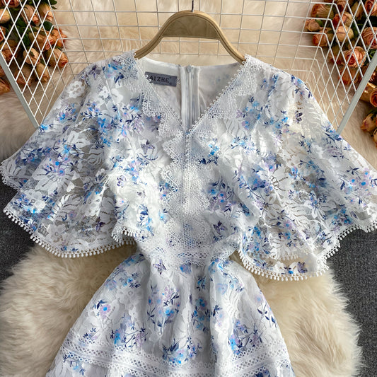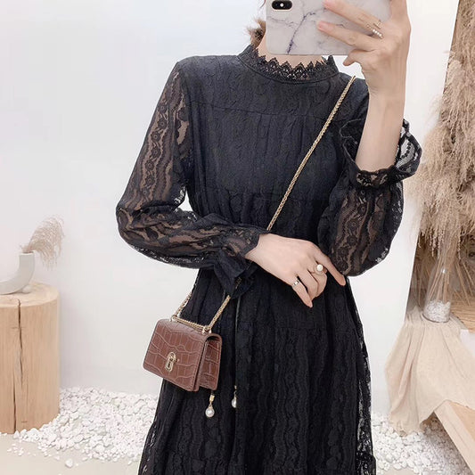 Robe de fée fine à manches longues et col rond en dentelle ajourée taille haute 3872