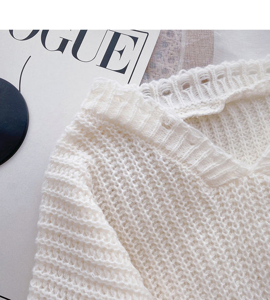 Pull tricoté ajouré décontracté à manches longues de couleur unie 6131
