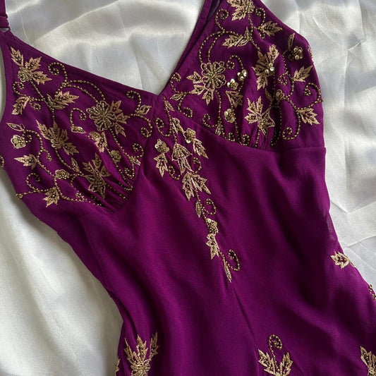 Robe courte asymétrique sans manches, dos nu, col en V, en mousseline violette dégradée : tissu en mousseline, finitions froncées, paillettes étoiles, coupe cintrée élégante, robe de cocktail gh6621