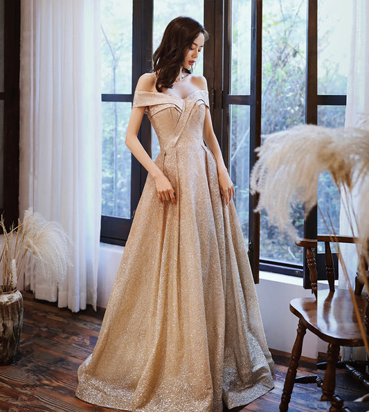Robe de soirée longue en paillettes dorées, coupe A, 8573