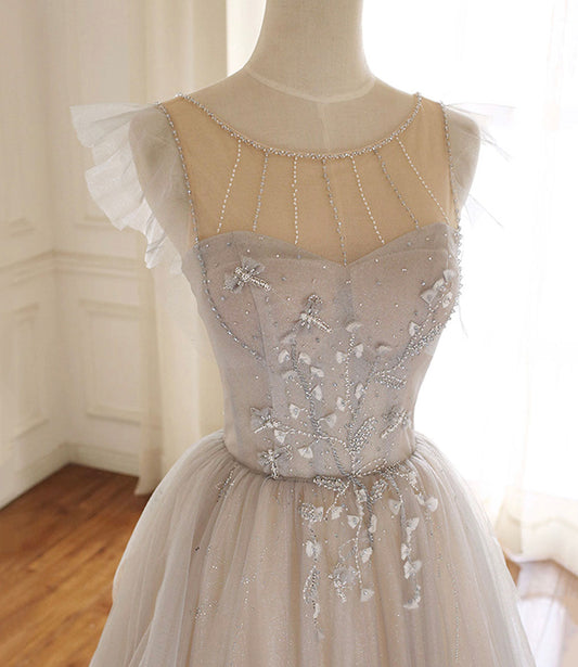 Robe de soirée trapèze longue en tulle, élégante et mignonne, lilas, avec perles, 10572