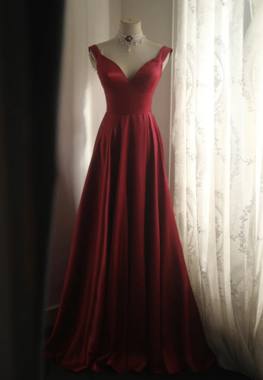 Girlhomeshops - Robe de soirée trapèze en satin rouge vin sans manches, longueur au sol, gh5832