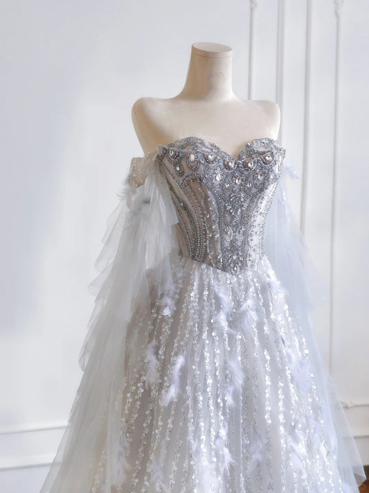 Girlhomeshops - Robe de mariée longue en tulle gris violet avec plumes et diamants, perles exquises, gh5486