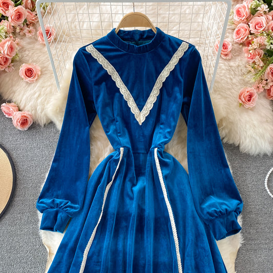 Robe à col en V en dentelle française Jupe trapèze ample à volants 3111