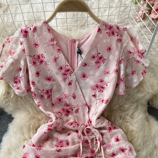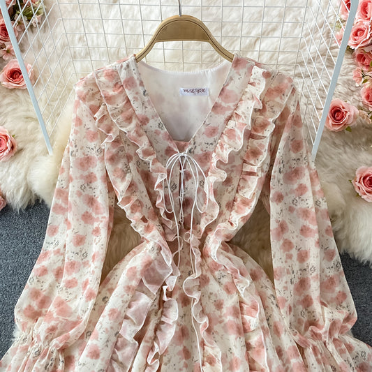 Robe fleurie en mousseline de soie à volants et col en V 3067