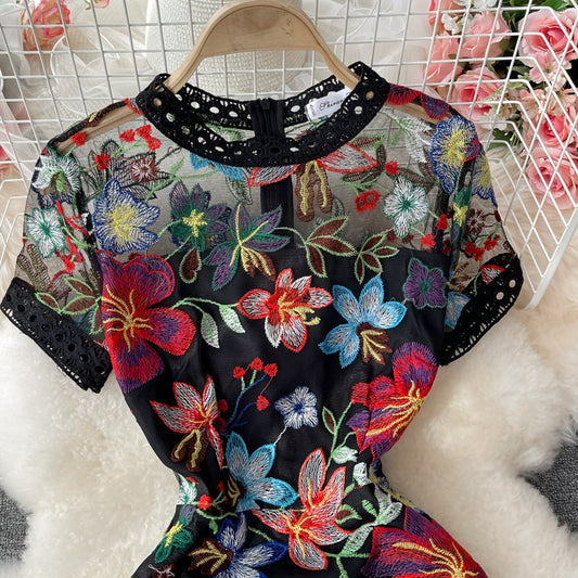 Robe brodée en maille ajourée avec volants décoratifs à la taille 3060