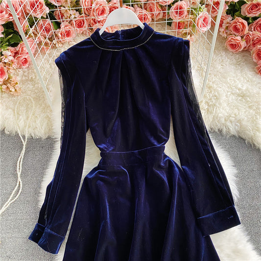 Robe trapèze en velours à épaules dénudées et col montant 3034