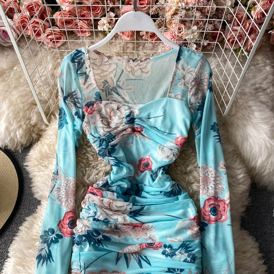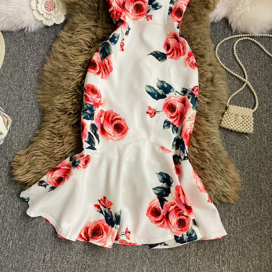 Robe mi-longue sexy sans bretelles à volants et imprimé slim 3031