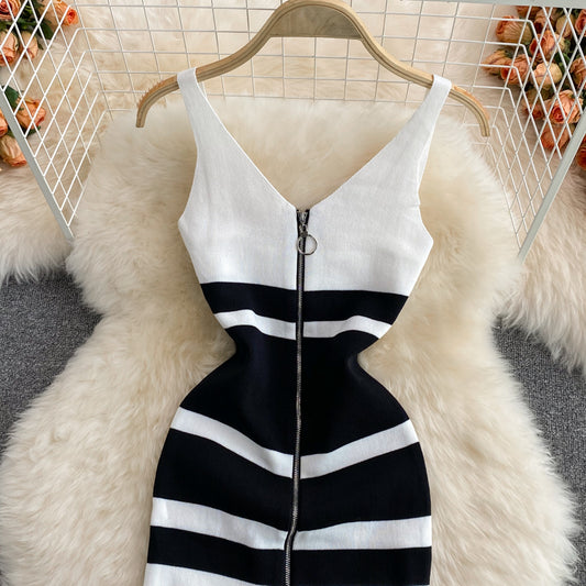 Jupe gilet en tricot mi-longue contrastée à col en V et fermeture éclair sans manches 2992
