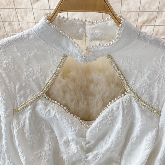 Jupe longue à manches lanternes et col rond avec broderie ethnique 3005