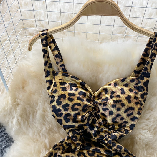 Robe plissée léopard à taille fine et fente sur les fesses 2757