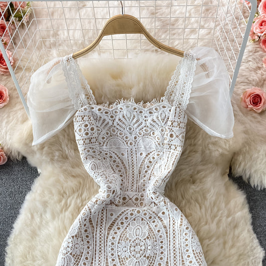 Robe en dentelle à col carré, manches bouffantes, taille haute, coupe ajustée, moyenne et longue, 2731
